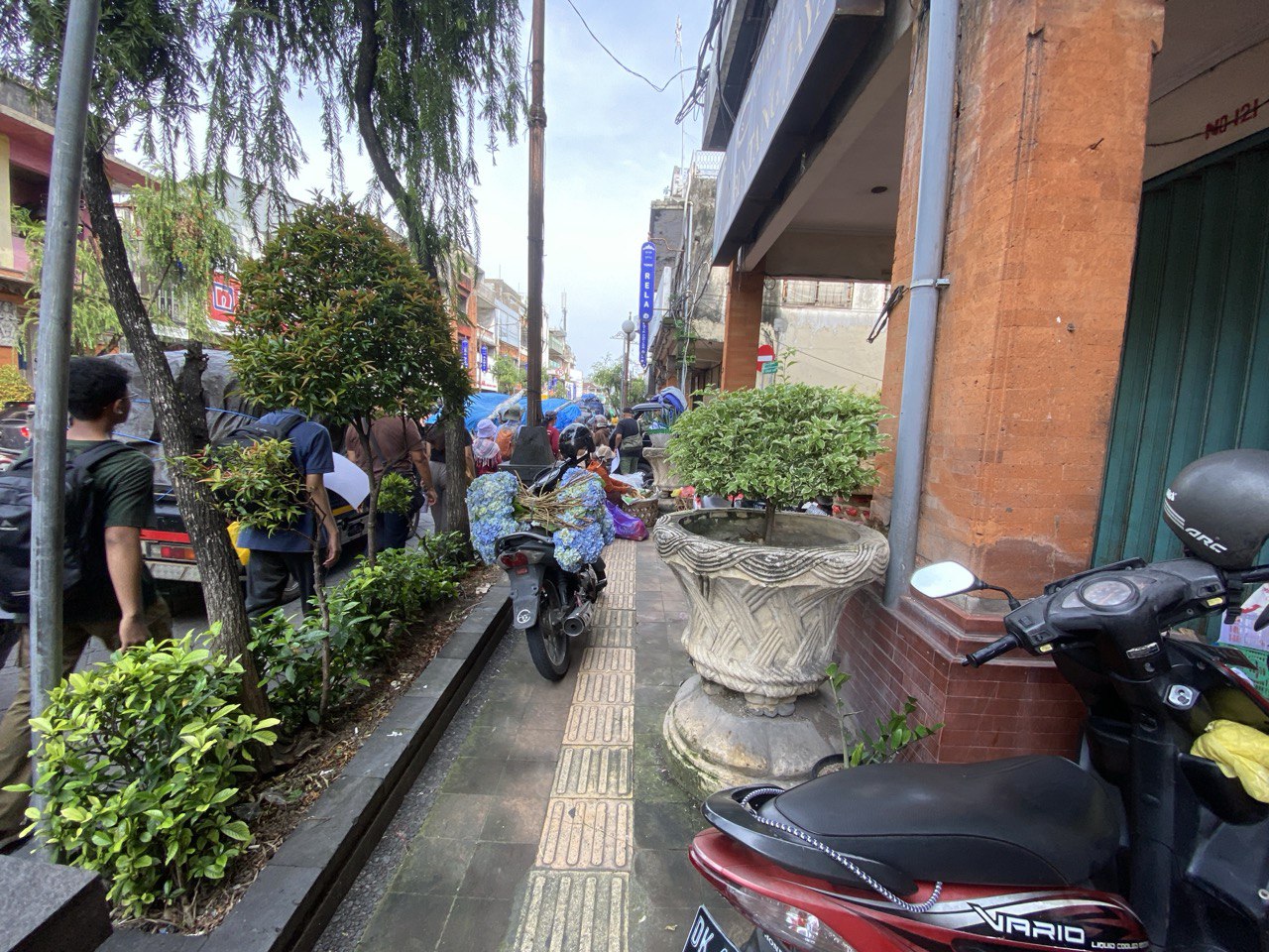 Berbeda dengan trotoar di depan Denpasar Cineplex, trotoar di depan Pasar Badung tidak dilengkapi guiding block untuk tuna netra. Meskipun ada guiding block, jalur kuning tersebut beberapa kali terputus oleh penutupan drainase yang bermotif bunga. Tak hanya kendaraan dan pot yang menghalangi akses trotoar, material konstruksi juga menghalangi sebagian akses trotoar.