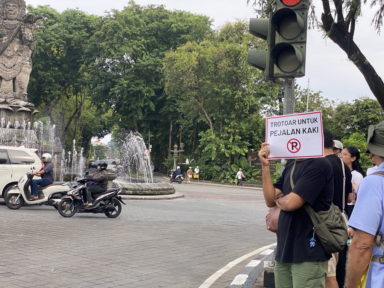 Di tengah perjalanan, kami menepi sejenak untuk berbagi perasaan selama berjalan beberapa menit. Agung, fasilitator Kopeka Bali, menjelaskan di persimpangan Jalan Gajah Mada seharusnya ada pohon peneduh untuk pejalan kaki. Namun, pohon ini ditebang karena tumbang ketika angin kencang beberapa waktu lalu. Peserta lain juga menyoroti pohon dan pot yang menghalangi trotoar selama perjalanan.