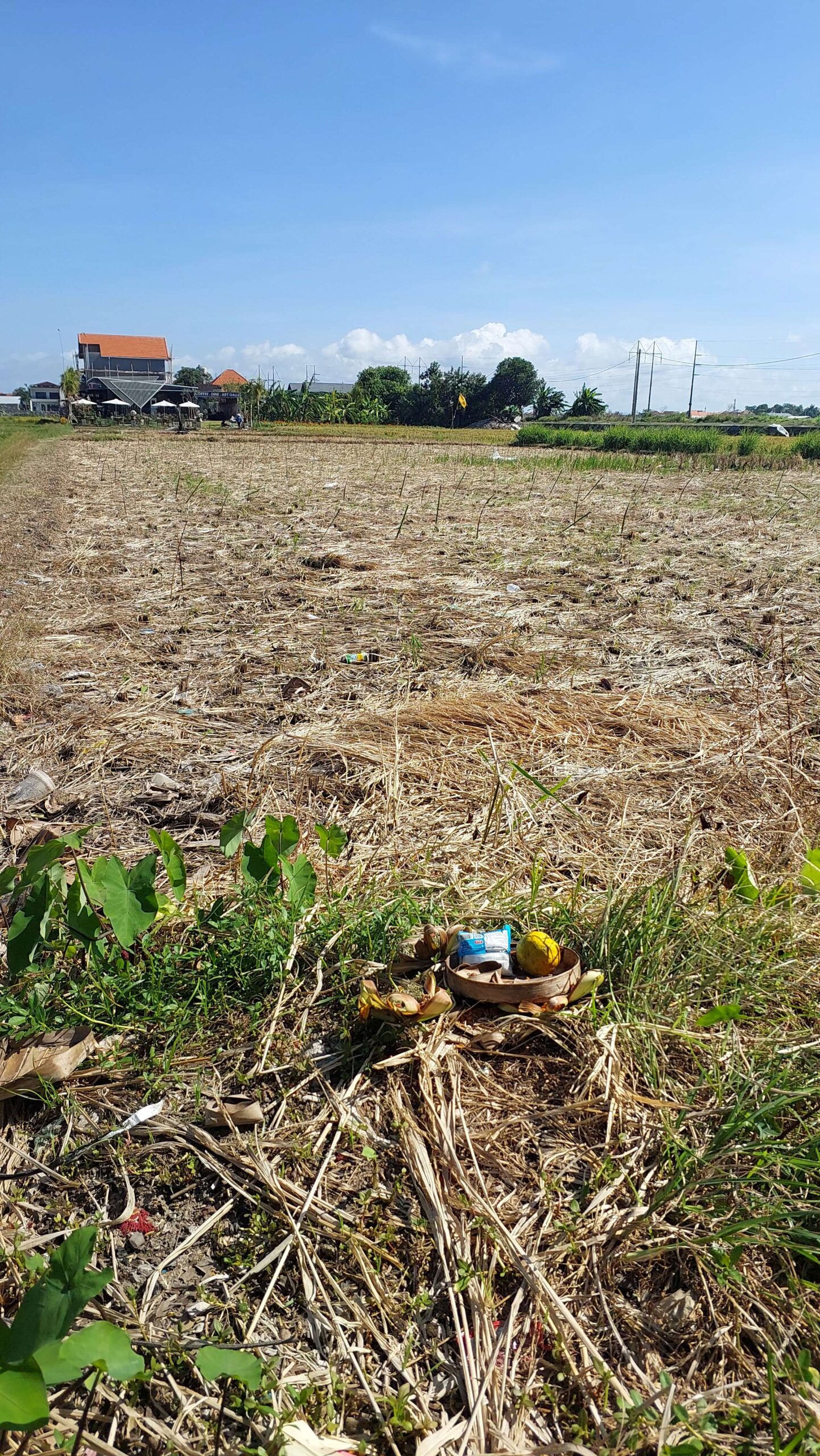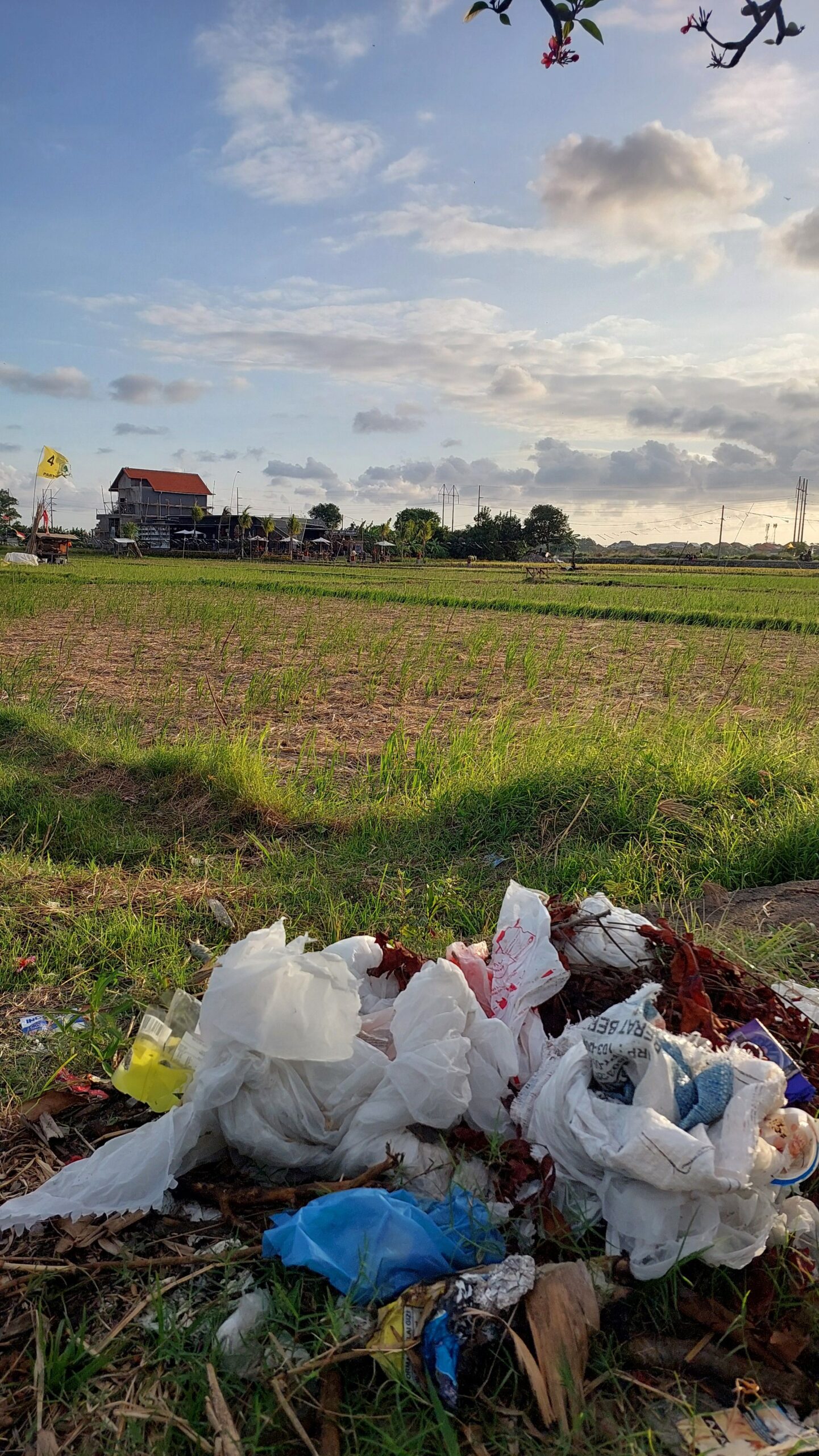Sarana upakara yang semestinya menjadi ungkapan rasa syukur petani, malahan mengandung jajanan berbungkus plastik, yang berakhir ditinggalkan menjadi sampah di area sawah.