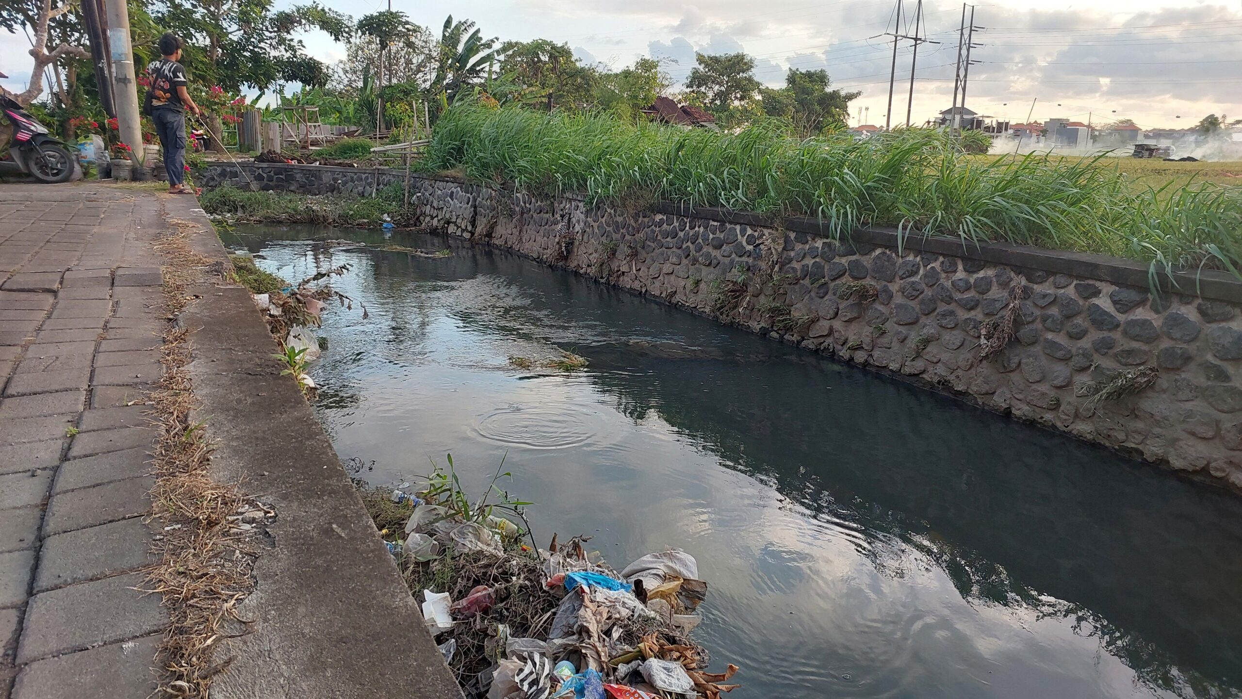 Sampah plastik mudah ditemukan di aliran air Subak Intaran, dari saluran air besar hingga saluran yang kering. Meski demikian, masih ada pemancing yang mencoba peruntungan menangkap ikan di aliran air yang besar.