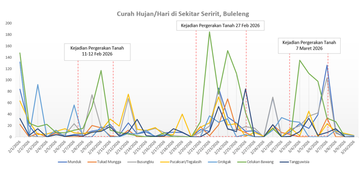 Lebih mengkhawatirkan lagi, perhitungan lanjutan dengan memperhitungkan tekanan air pori menunjukkan bahwa lereng akan runtuh (FK turun menjadi 0,98) jika muka air tanah naik hanya setinggi satu meter di atas bidang gelincir. Artinya, dibutuhkan akumulasi curah hujan sekitar 250 mm untuk memicu kondisi tersebut. Angka itu bukan tidak mungkin terjadi — data BMKG dari Stasiun Celukan Bawang mencatat curah hujan harian mencapai 175 mm/hari pada 22 Februari 2026, hanya beberapa hari sebelum gerakan tanah terjadi. Dan ada faktor yang lebih berbahaya dari sekadar total curah hujan: retakan-retakan yang kini menganga di permukaan berfungsi layaknya jalan tol bagi air hujan — mengalirkan langsung air ke bidang gelincir tanpa harus menunggu tanah jenuh terlebih dahulu.