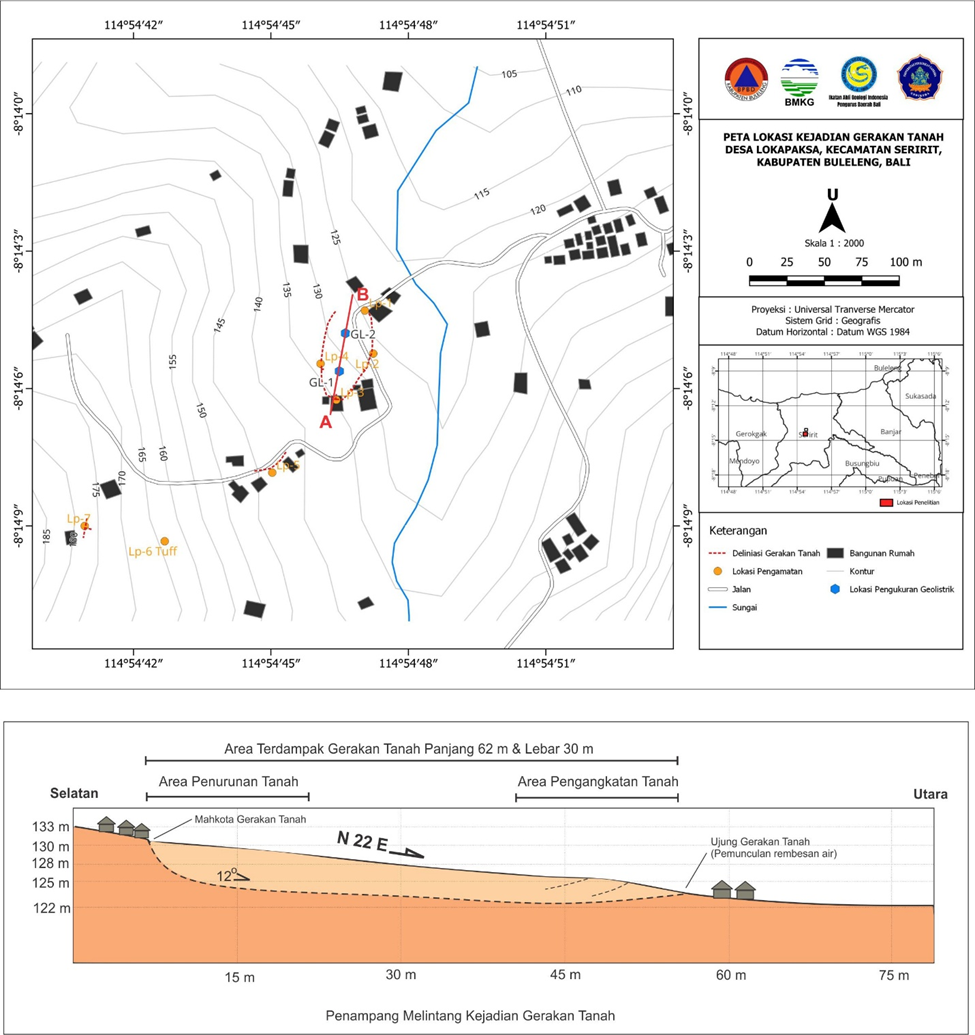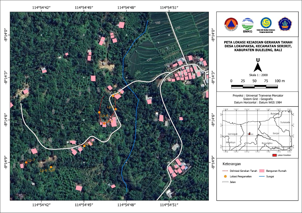 Koordinat bencana tercatat pada titik 8.235023°, 114.912946°, di ketinggian 120 hingga 133 meter di atas permukaan laut. Secara geomorfologis, Dusun Sorga Mekar bertengger di bentangalam denudasional struktural — perbukitan berlembah yang morfologinya dibentuk oleh kontrol dua sesar besar: Sesar Pupuan dan Sesar Seririt yang berpotongan di kawasan itu. Lerengnya landai bergelombang dengan kemiringan 12 hingga 18 derajat — cukup untuk membuat tanah bergerak jika kondisi bawah permukaannya melemah.