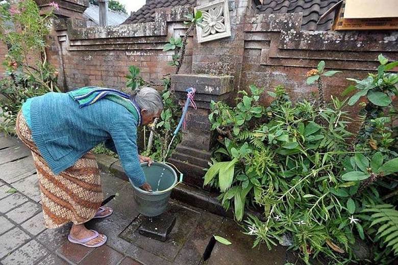Seorang nenek mencari air di sumber air umum di Desa Pelaga, Badung (sumber photo BaliPost/Eka)