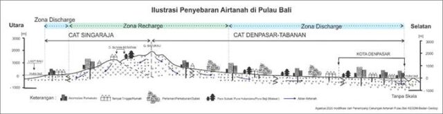 Bali memiliki setidaknya memiliki 8 Cekungan Air Tanah (CAT) tiga di antaranya CAT Denpasar–Tabanan, CAT Buleleng, dan CAT Karangasem. Pusat-pusat recharge area atau daerah imbuhan utama berada di dataran tinggi tengah, di sekitar bentangalam Gunung Batur, Buyan–Beratan dan Gunung Agung, tempat hujan deras jatuh dan meresap ke dalam tanah. Namun air yang meresap itu kemudian bergerak perlahan ke arah selatan melalui celah dan pori batuan vulkanik, hingga akhirnya muncul kembali sebagai airtanah dangkal di daerah pesisir (JICA, 2012).