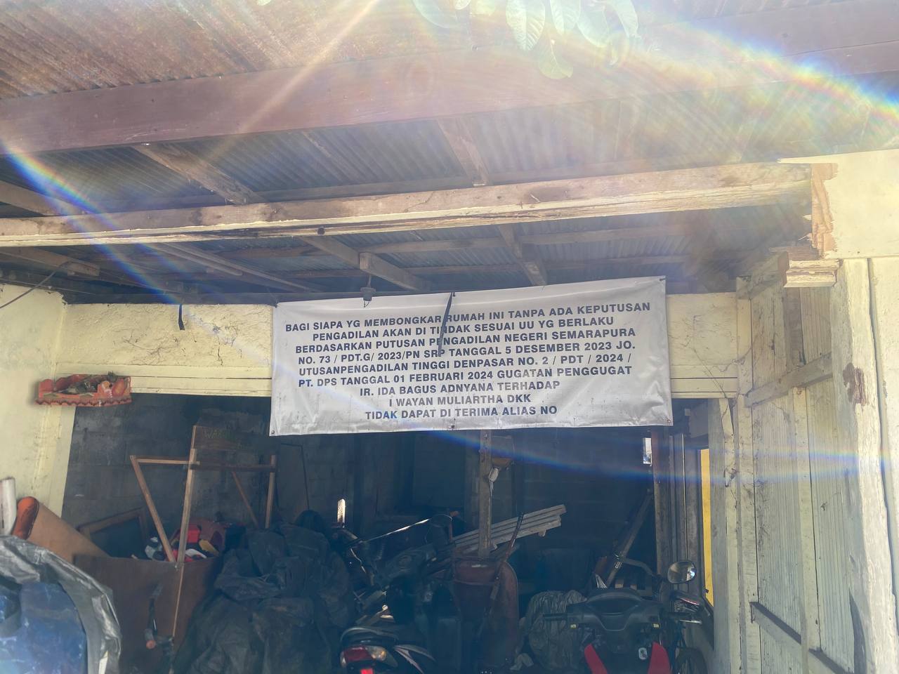 “Bagi siapa yang membongkar rumah ini tanpa ada keputusan pengadilan akan ditindak sesuai UU yang berlaku berdasarkan Putusan Pengadilan Negeri Semarapura No. 73/PDT.G/2023/PN SRP tanggal 5 Desember 2023 Jo. Utusan Pengadilan Tinggi Denpasar No. 2/PDT/PT. DPS tanggal 01 Februari 2024 gugatan penggugat Ir. Ida Bagus Adnyana terhadap I Wayan Muliarta, dkk. Tidak dapat diterima alias no.”