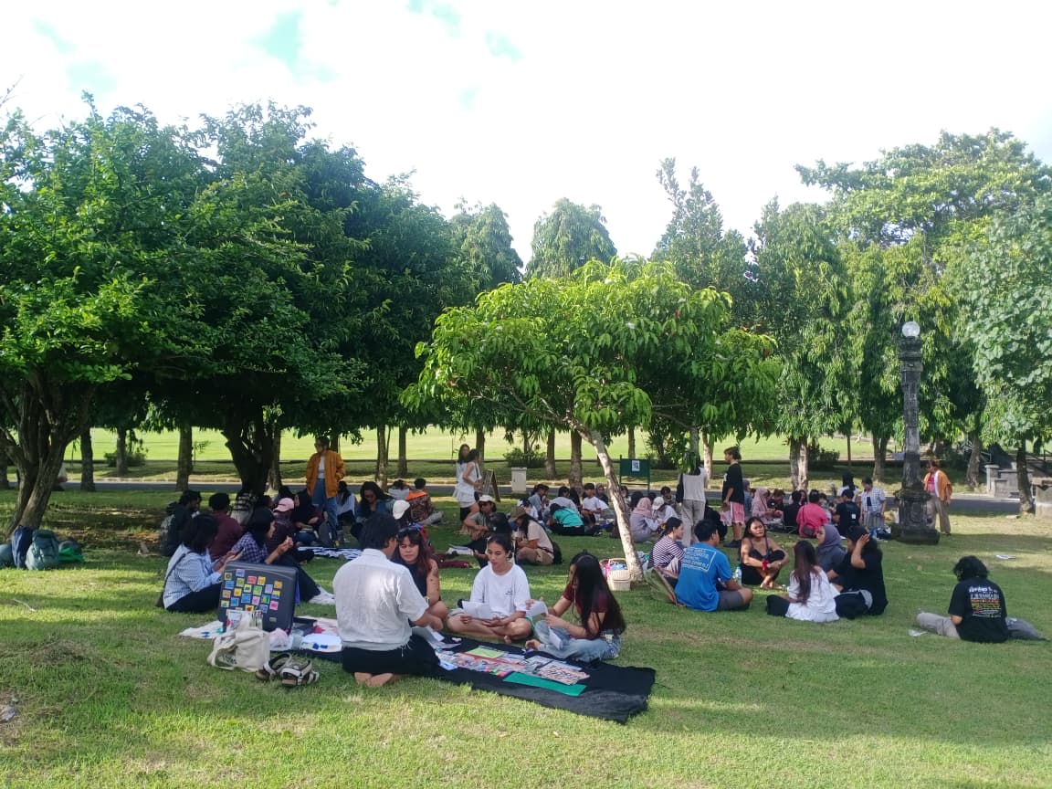 Siapa sangka piknik hari itu berhasil menggores bagian istimewa dalam catatan saya. Bahwa piknik juga bisa menjadi ruang bersantai, belajar, bahkan perlawanan. Berlokasi di lapangan Monumen Bajra Sandhi yang berdiri kokoh di tengah kota Denpasar, anak-anak muda dengan untaian pernak-pernik mereka berkumpul di bawah teduhnya pohon kota. Sabtu, 29 November 2025, sekitar pukul 2 siang, tikar-tikar berbahan kain mulai dibentangkan di atas tanah dan rerumputan. Wanita, pria, segala usia, segala latar belakang duduk melingkar dengan berbagai niat, dan kegemaran.