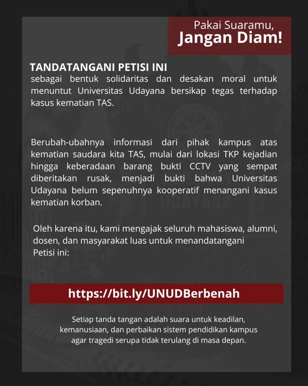 Aliansi ini berharap tandatangani Petisi sebagai bentuk solidaritas dan desakan moral untuk menuntut Universitas Udayana bersikap tegas terhadap kasus kematian TAS. Kita semua sudah mendengar kasus kematian TAS di lingkungan Kampus Universitas Udayana. Namun informasi yang disampaikan pihak kampus berubah-ubah, mulai dari lokasi TKP kejadian hingga keberadaan barang bukti CCTV yang sempat diberitakan rusak.