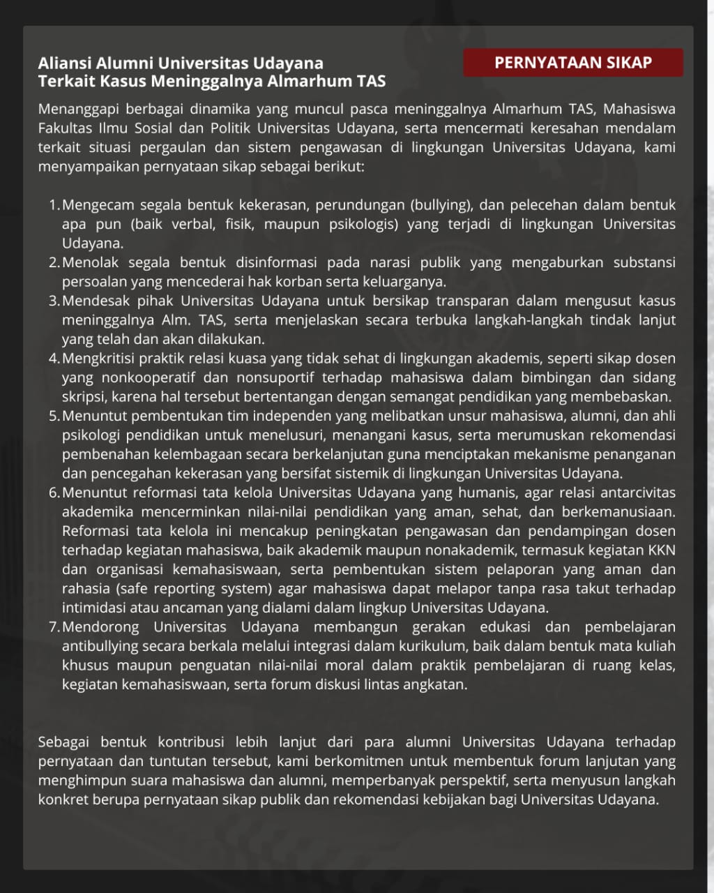Merespon lambatnya Ikatan Alumni Universitas Udayana (Ikayana) terhadap kejadian meninggalnya Alm. TAS, mahasiswa Sosiologi angkatan 2022, pada 15 Oktober. Maka beberapa Alumni Unud membuat suatu pernyataan sikap merespon kasus tersebut. Diskusi pembuka ini dimulai pada 19 Oktober 2025 lalu dilanjutkan pada malam, 20 Oktober 2025.
