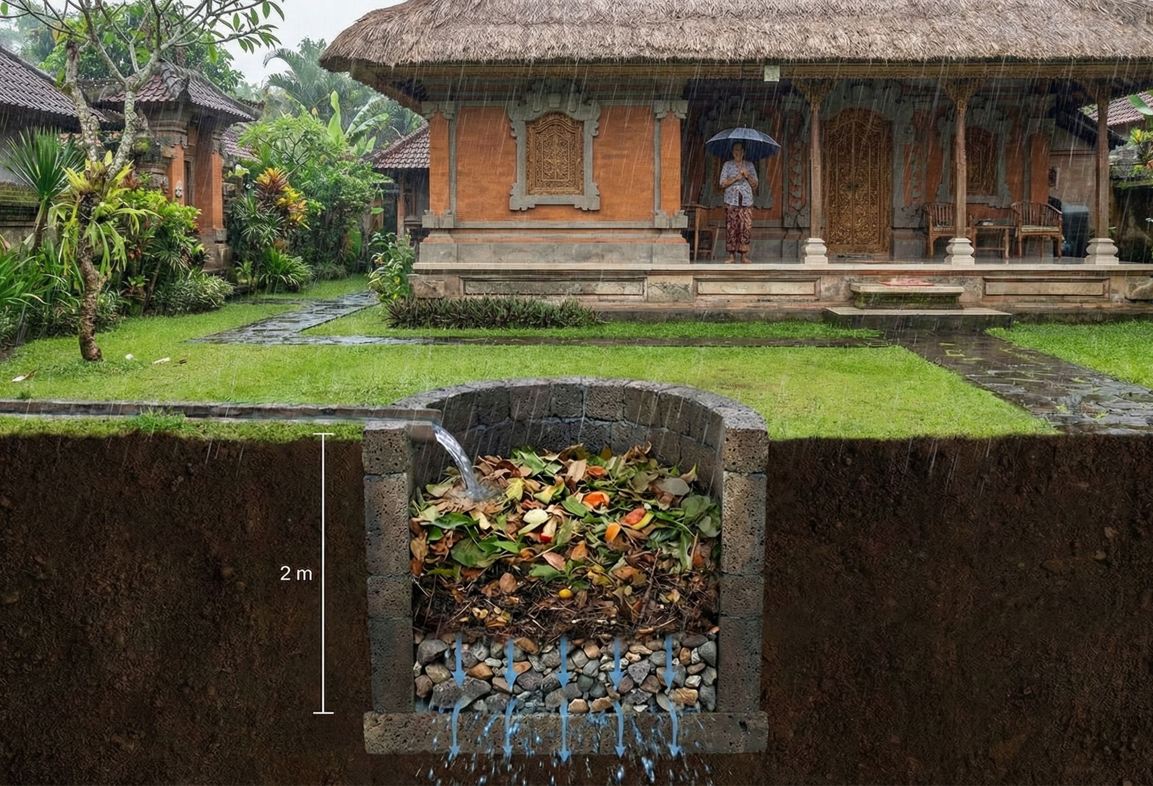 Di Bali, istilah tebe bukan hal baru. Secara tradisional, tebe merujuk pada area di belakang rumah yang digunakan untuk mengelola sisa dapur dan limbah organik secara alami. Selama puluhan tahun, sistem ini bekerja sederhana: sisa makanan dikubur, terurai, dan kembali menjadi bagian dari tanah. Namun seiring urbanisasi, keterbatasan lahan, dan meningkatnya produksi sampah, praktik tebe konvensional mulai ditinggalkan. Dari sinilah lahir tebe modern sebuah inovasi yang memadukan pengelolaan sampah organik, sanitasi lingkungan, dan kini berpotensi besar sebagai sumur resapan air hujan.