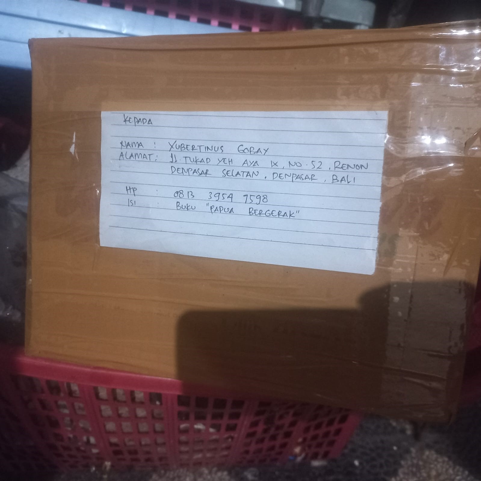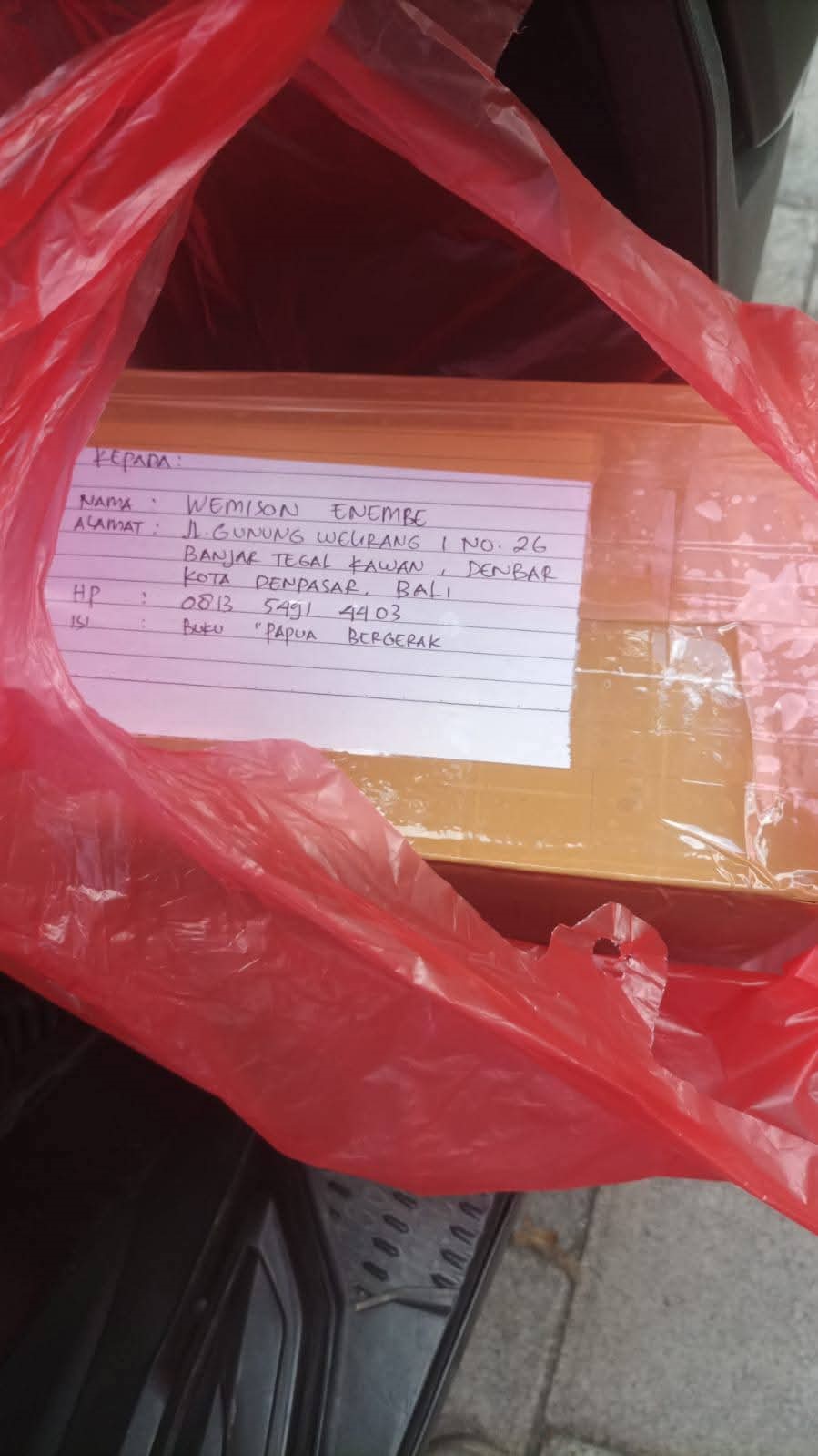 Kedua paket diantar ke tempat yang berbeda. Paket atas nama Wemison Enembe dikirim ke Jalan Gn. Welirang 1, sedangkan paket atas nama Yubertinus Gobay ke Asrama Papua (Aspura) di Jalan Tukad Yeh Aya No 52, Denpasar Selatan. Dua paket tersebut berisi sama, yaitu kepala babi yang sudah busuk, satu tulang, serta tanah hitam yang dibungkus plastik hitam dan dimasukan dalam karton berlapis plastik merah. Dalam paket karton juga ditulis nama, alamat, nomor telepon, dan isi buku.