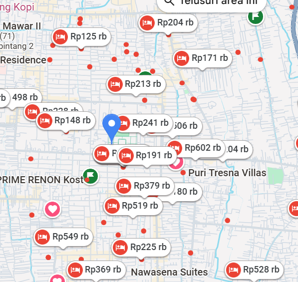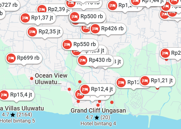 Saya mencoba menelusuri harga hotel di sekitar Lapangan Puputan Renon dan Ungasan menggunakan Google Maps. Kata kunci yang digunakan adalah ‘hotel di sekitar Lapangan Puputan Renon’ dan ‘hotel di Ungasan’. Hasilnya, Google Maps menampilkan rekomendasi hotel di sekitar Lapangan Puputan Renon dengan kisaran harga Rp150.000 – Rp500.000 per malam. Sementara itu, harga hotel di Ungasan berkisar Rp500.000 – Rp15.000.000 per malam.