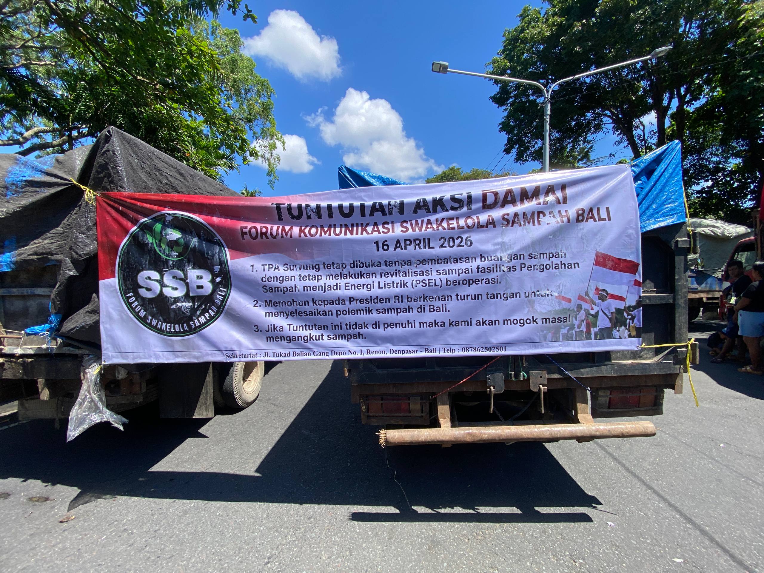 Ratusan truk sampah kembali memadati kawasan Renon pada Kamis, 16 April 2026. Aksi yang digelar oleh Forum Komunikasi Swakelola Sampah Bali (FSSB) ini berlangsung di depan Kantor Pusat Pengendalian Lingkungan Hidup (Pusdal) Bali Nusra. Deretan truk sampah terparkir sepanjang Jalan Ir. H. Juanda hingga depan Kantor Gubernur Bali.